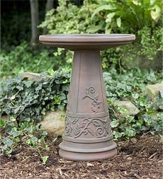 Telford Birdbath. Handcrafted with time-honored tradition in Roseville, Ohio, our Telford Collection will grace your landscape with its distinctive design. Local artisans employ old-fashioned hand techniques to produce pottery of the highest quality, craftsmanship and detail. Each beautiful piece will make a lasting impression in your garden for years to come. Our Telford Birdbath is a beautiful addition to your gardenscape and the perfect place for your favorite songbirds to bathe. Its clean lines and beautiful detail highlight the unique iron glaze, creating the look of a well-loved, time-worn accent. Size 17" dia. x 22"H Shipping Allow 1-2 weeks for delivery